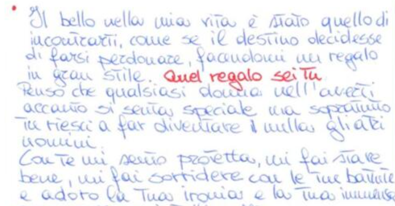 “Il bello nella mia vita è stato quello di incontrarti, come se il destino decidesse di farsi perdonare facendomi un regalo in grande stile. Quel regalo sei tu”.