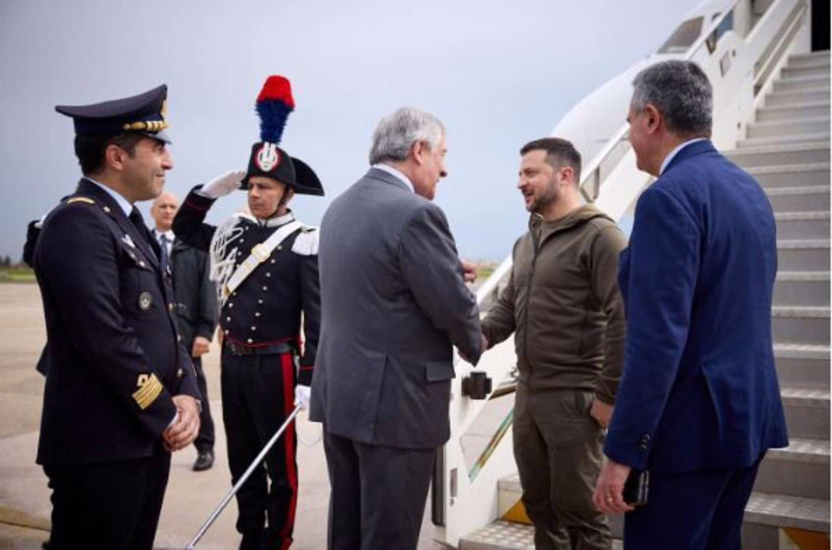 Fra ingenti misure di sicurezza e con due carabinieri e due avieri schierati in alta uniforme ai piedi della scaletta, il presidente dell’Ucraina è stato accolto dal vicepremier e ministro degli Esteri Antonio Tajani, l’ambasciatore ucraino in Italia Yaroslav Melnyk e l’ambasciatore d’Italia a Kiev Pier Francesco Zazo.