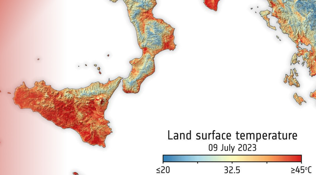 La dimostrazione è arrivata da una animazione della missione Sentinel-3 del programma di osservazione satellitare della Terra Copernicus, gestita dall’Agenzia Spaziale Europea (Esa) e dalla Commissione Ue. Rilevata la stessa temperatura al suolo anche in Puglia.