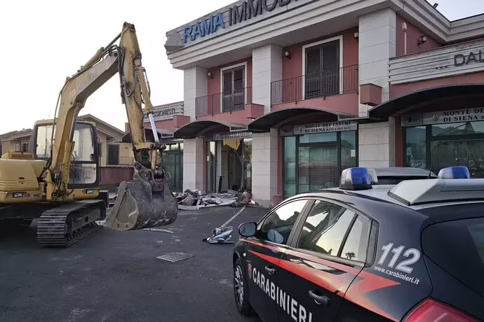 Utilizzando un escavatore rubato in zona, i malviventi nella cittadina del Catanese hanno demolito l’ingresso dell’istituto di credito nel tentativo di rubare due bancomat e una cassa continua.