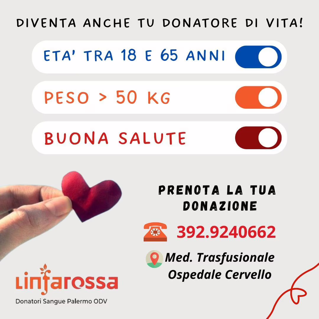 Attualmente vi è un calo di donatori e per tutto il periodo estivo si prevedono disagi all’ospedale Cervello di Palermo. Vieni a donare sangue contribuisci a salvare vite e dare speranza di una vita migliore a tante persone che soffrono.