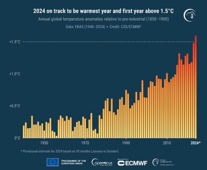 Il 2024 sarà quasi certamente l’anno più caldo e il primo sopra 1.5°C. E’ quanto rende noto il Servizio per il Cambiamento Climatico di Copernicus (Copernicus Climate Change Service – C3S).