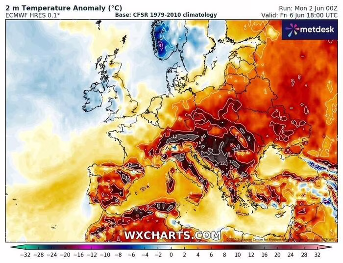Dopo un progressivo aumento che si verificherà tra Mercoledì 4 e Venerdì 6 Maggio, l’apice dell’ondata di calore è atteso a cavallo del weekend, quando il cuore rovente dell’anticiclone si posizionerà proprio sull’Italia centro-meridionale. In questa fase si potranno toccare e in alcuni casi superare i 36/37°C nelle aree interne della Puglia o addirittura raggiungere la soglia dei 40/41°C nell’entroterra della Sardegna, punte davvero notevoli per il mese di Giugno.Anomalie termiche previste per Venerdì 6 Giugno.
