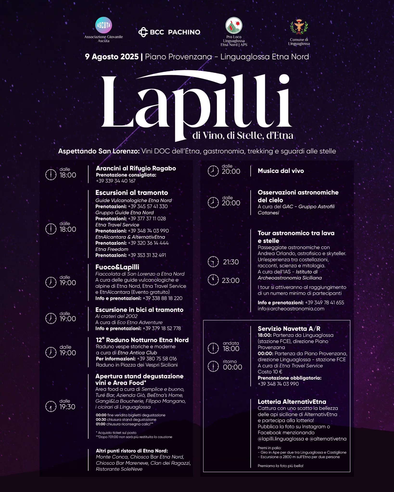 (com) Aspettando San Lorenzo,a Piano Provenzana Linguaglossa Etna Nord, sabato 9 agosto si terrà la manifestazione Lapilli , a partire dalle ore 18. L’evento celebra il territorio dell’Etna tra degustazioni, cultura, astronomia e tradizioni. Una serata immersi nella natura lavica di Piano Provenzana, per vivere l’Etna tra sapori autentici e osservazioni celesti.