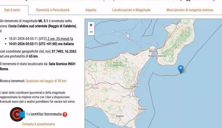 Forte scossa di terremoto di magnitudo 5.1 al largo della Calabria, poco prima delle 6,00 di questa mattina.