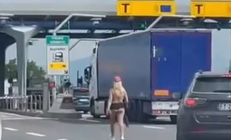 VIDEO - Una giovane donna, in abbigliamento da jogging ma a seno nudo, cammina tranquillamente sulla Firenze-Pisa